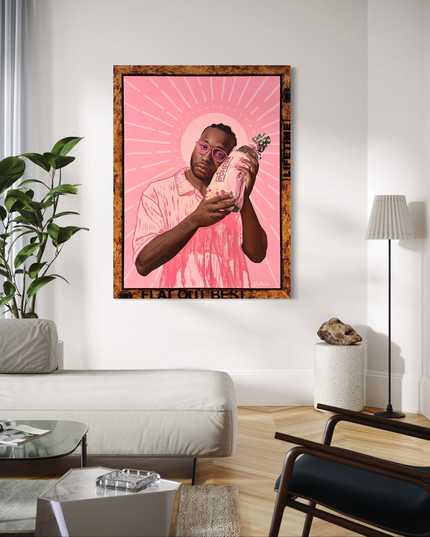 Rendered in Jonah’s signature pinks, this original painting is both portrait and myth — a meditation on struggle, dignity, and the triumph of identity.