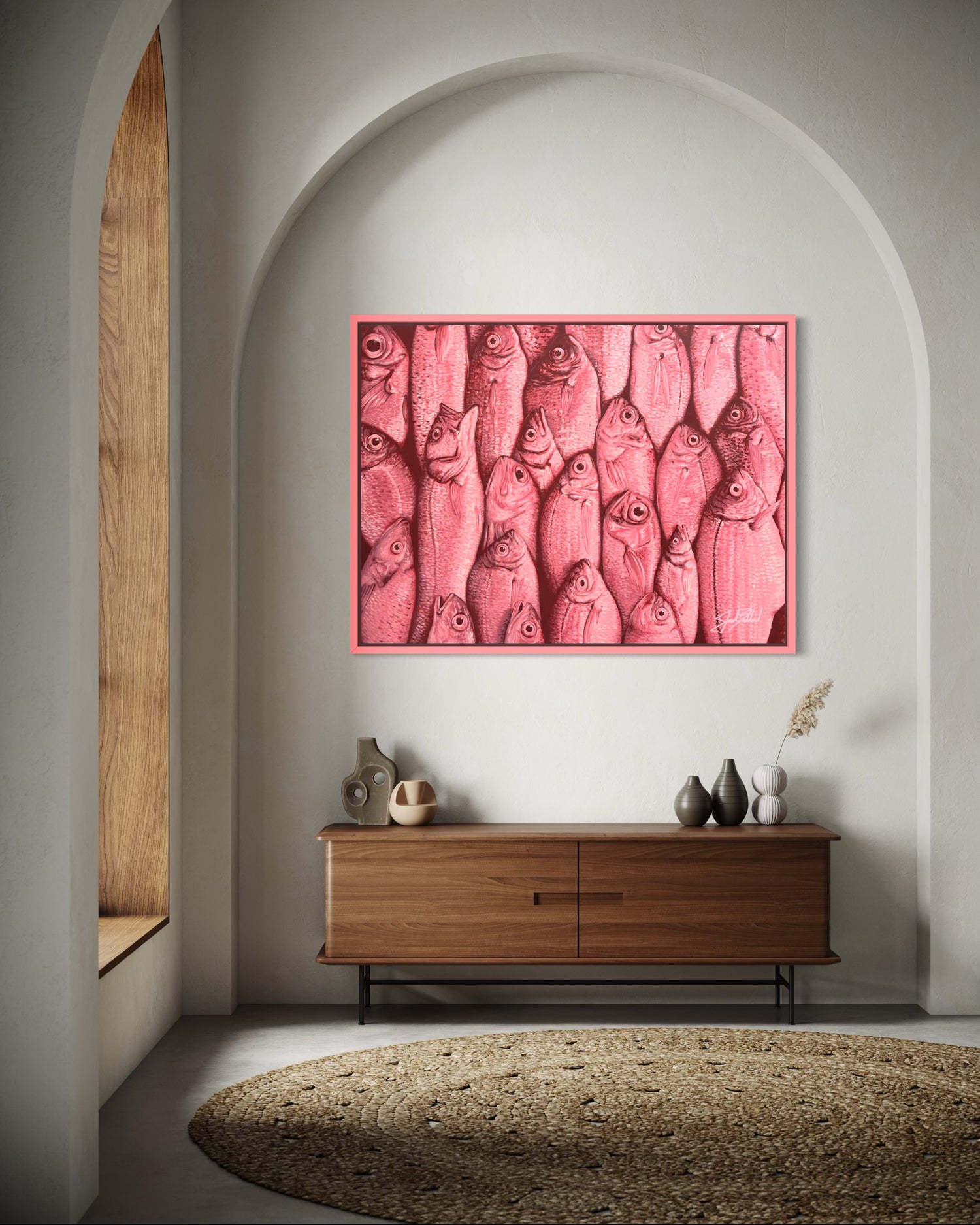 Strawberry Fish began with a creature out of place, or maybe exactly where it was always meant to be. The pink gives it softness, but also power. There’s movement in the stillness, and tension in the simplicity.