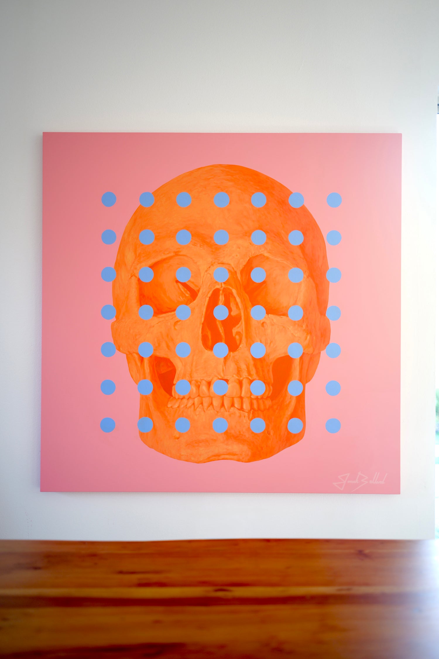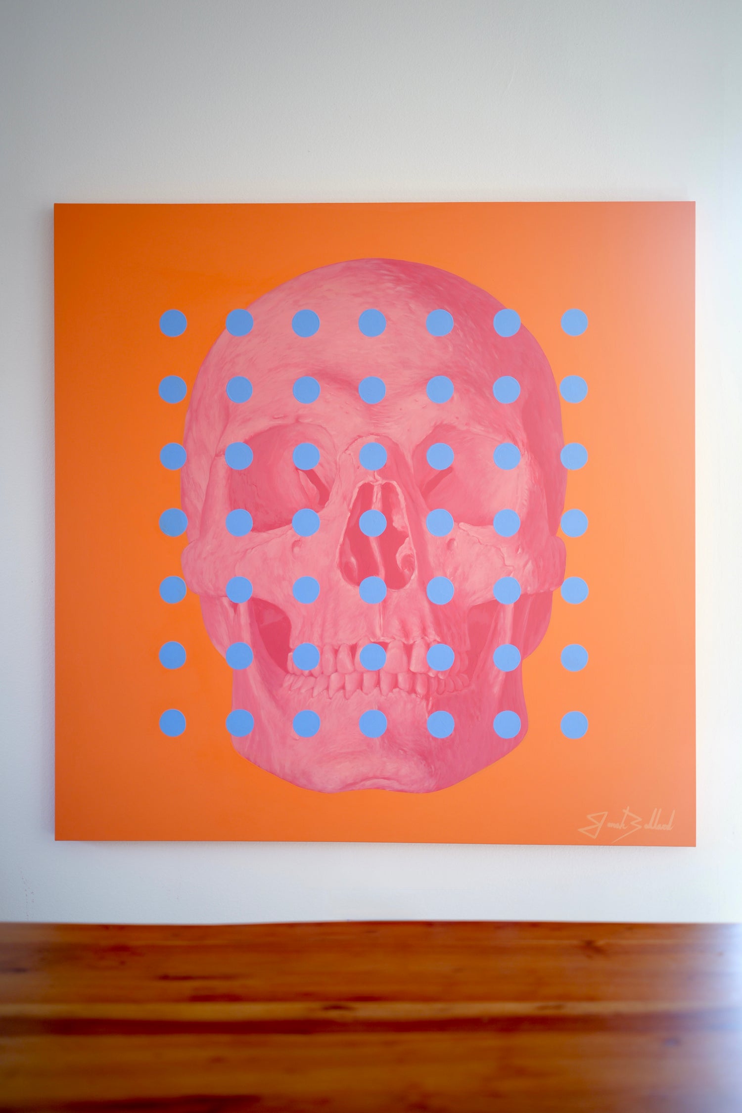 Veil to Opacity is a part of Jonahs 2026 Pink & Orange release. This original acrylic painting presents a pink skull emerging through a layered field of blue dots against a bold orange background, challenging the viewer’s perception with its shifting visual rhythm. The composition moves between distortion and revelation, reflecting the richness that appears when the veil begins to lift. Grounded in modern art and abstract portrait art, it speaks to a deeper sense of completion and awareness without needing to define it. A striking, one-of-a-kind piece for collectors seeking contemporary artwork that transforms a space and invites contemplation.